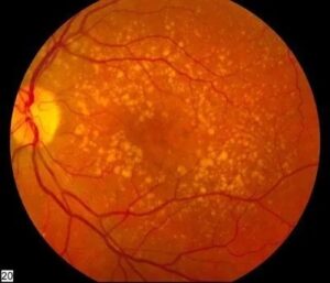 Macular degeneration is caused by the build-up of amyloid beta plaques in the back of the eye. Amyloid beta plaques is the same substance that cause Alzheimer’s disease. Additionally, patients with AMD often have fatty deposits called “Druzen Deposits” that build up in the retina.